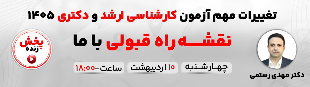 در روز چهارشنبه ۱۰ اردیبهشت پخش زنده ویژه ای در خصوص تغییرات مهم آزمون کارشناسی ارشد و دکتری در نظر گرفتیم تا با بررسی هر یک از این مقاطع بصورت جداگانه برنامه ریزی جدید و ویژه ای برای آماده سازی آزمون ها داشته باشیم.